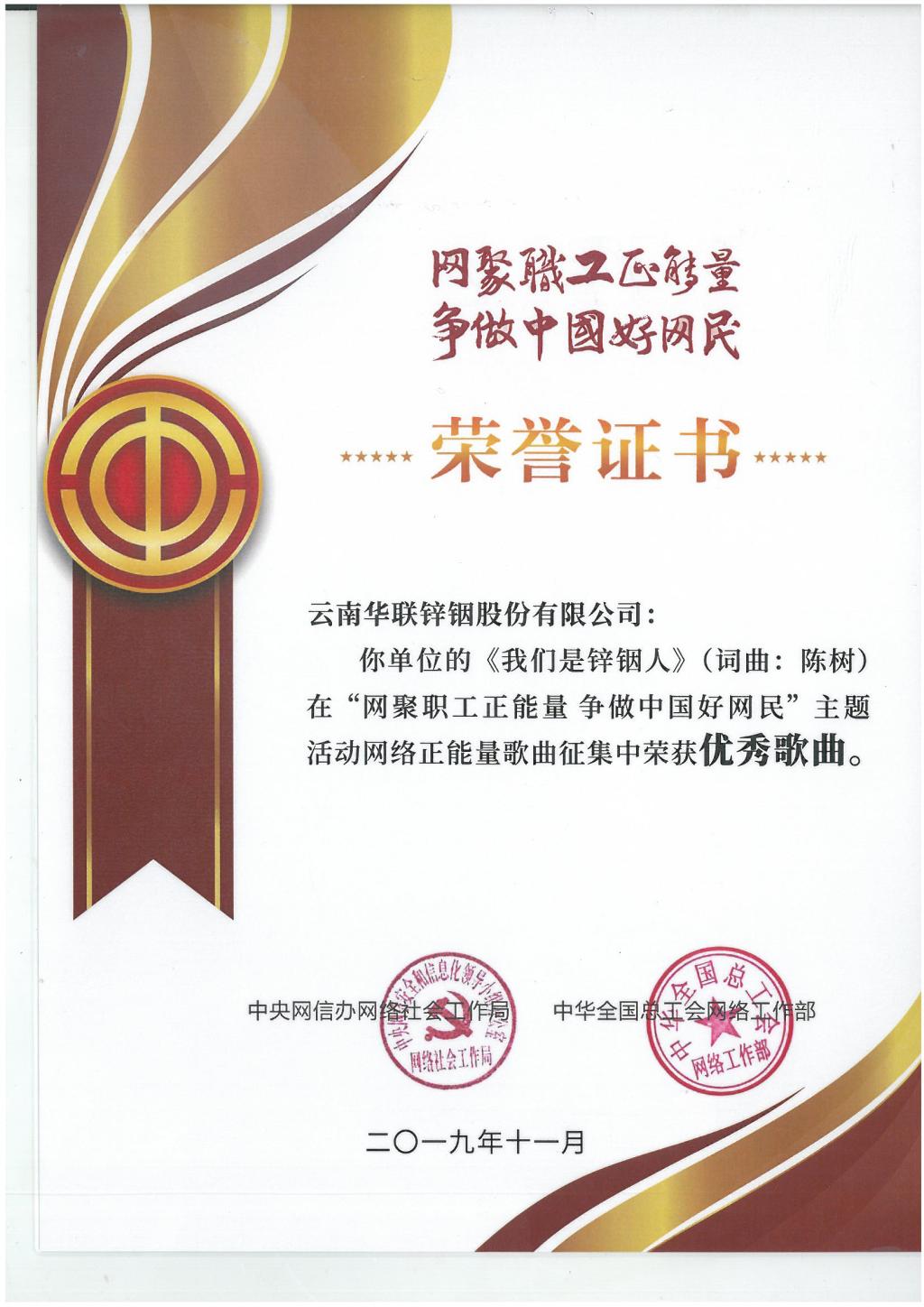 近期,華聯(lián)鋅銦公司形象歌曲—《我們是鋅銦人》MV在全國“網(wǎng)聚職工正能量 爭做中國好網(wǎng)民”主題活動(dòng)網(wǎng)絡(luò)正能量歌曲征集中榮獲優(yōu)秀歌曲。