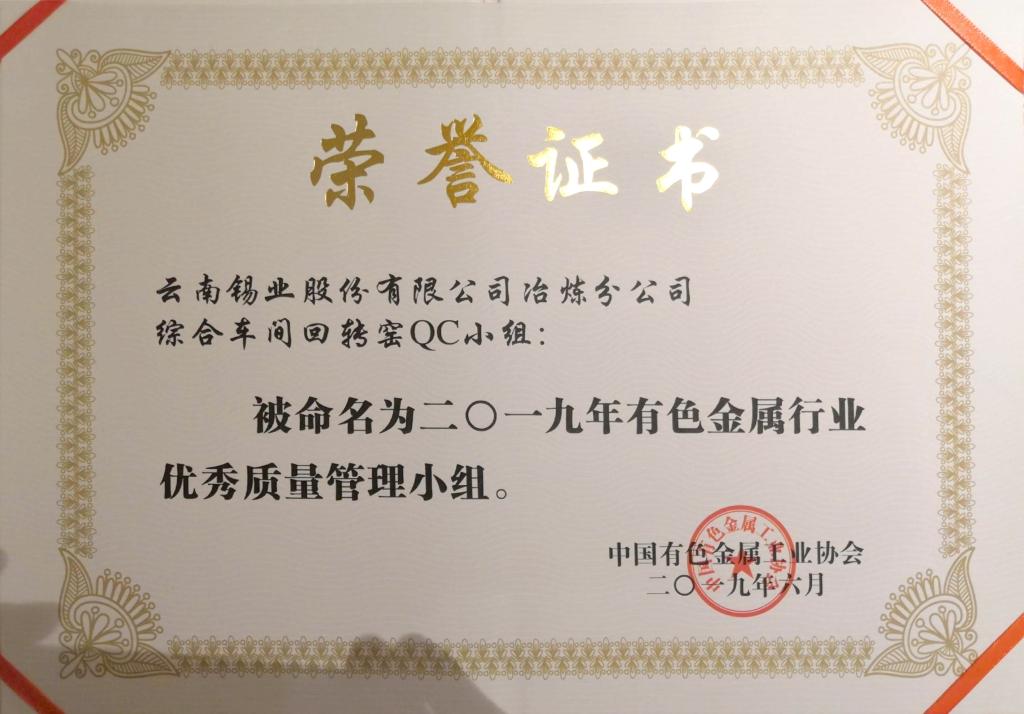 7月10日,在2019年度有色金屬行業(yè)全國(guó)優(yōu)秀質(zhì)量管理小組及全國(guó)質(zhì)量信得過班組評(píng)審會(huì)上,冶煉分公司綜合車間回轉(zhuǎn)窯QC小組榮獲“全國(guó)優(yōu)秀質(zhì)量管理小組”榮譽(yù)稱號(hào),其QC成果榮獲“囯優(yōu)”獎(jiǎng)項(xiàng),該成果也是云南省有色金屬行業(yè)唯一一個(gè)獲得“國(guó)優(yōu)”獎(jiǎng)項(xiàng)的QC成果。