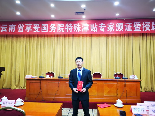 4月12日,在云南省2018年獲國務(wù)院政府特殊津貼專家頒證暨新設(shè)立專家基層科研工作站和省級博士后站授牌活動會上,老廠分公司竹葉山坑一工區(qū)采礦一隊(duì)隊(duì)長、高級技師楊勇榮獲2018年國務(wù)院政府特殊津貼。云南省人社廳黨組副書記、副廳長和江峰、副廳長邢渭東、省委組織部人才工作處處長肖峰出席活動并為2018年榮獲享受國務(wù)院政府特殊津貼的48位各行各業(yè)專家人才現(xiàn)場頒發(fā)證書。