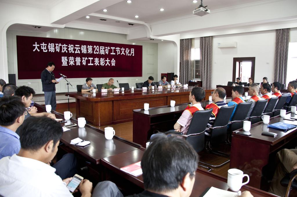 8月31日,大屯錫礦五樓會議室喜氣洋洋,前排就座的10名榮譽礦工身披授帶,滿面笑容地歡慶礦工自己的節日,接受礦部表彰。大屯錫礦經理張春芳主持會議。