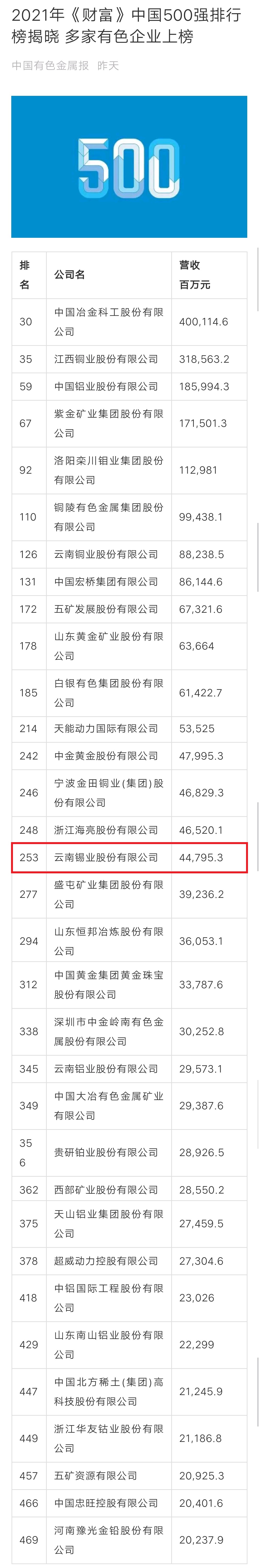7月20日,2021年《財富》中國500強排行榜揭曉。今年500家上榜的中國上市公司總營業(yè)收入達(dá)到53萬億元人民幣,較去年增長5%;凈利潤達(dá)到了4.3萬億元,較去年增長約2%。云南錫業(yè)股份有限公司以營收447.95億元的業(yè)績,排名第253位。
