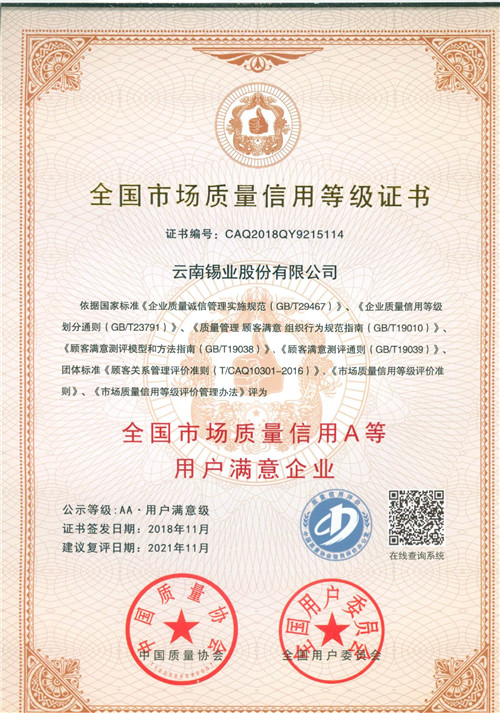 錫業(yè)股份積極參加中國質(zhì)量協(xié)會(huì)組織的“2018年度市場質(zhì)量信用等級評價(jià)”活動(dòng),通過企業(yè)申請、行業(yè)協(xié)會(huì)推薦、第三方專業(yè)機(jī)構(gòu)評價(jià)、專家評審、委員會(huì)審定、征詢意見等程序?qū)徍耍瑢ι陥?bào)企業(yè)的質(zhì)量信用意愿、質(zhì)量保障能力、市場經(jīng)營能力等三個(gè)一級指標(biāo)及若干個(gè)二、三級指標(biāo)進(jìn)行綜合評價(jià),全面綜合考核企業(yè)的誠信建設(shè)與市場質(zhì)量信用管理能力和水平,錫業(yè)股份榮獲“2018全國市場質(zhì)量信用AA等用戶滿意企業(yè)” 榮譽(yù)證書及獎(jiǎng)牌。