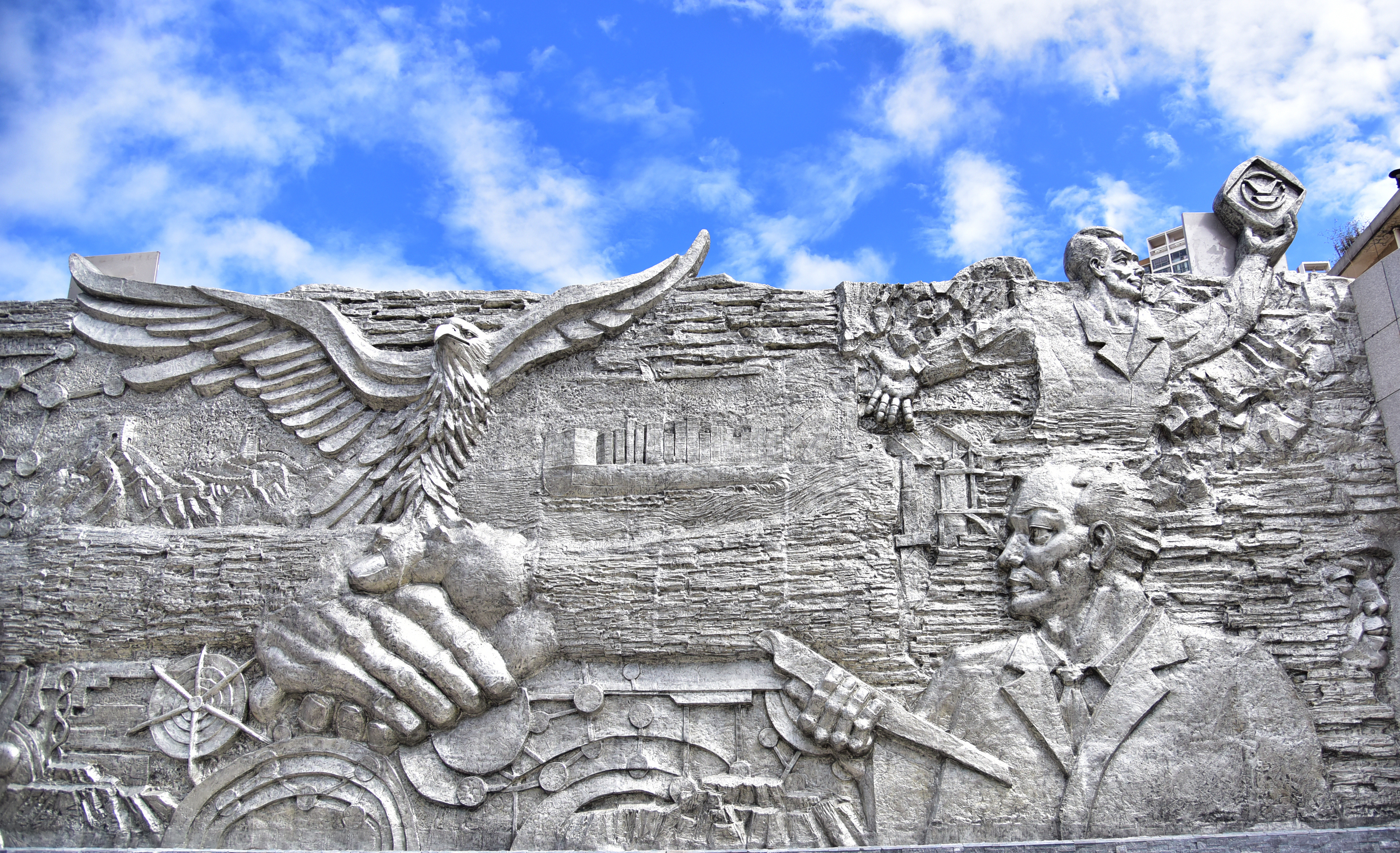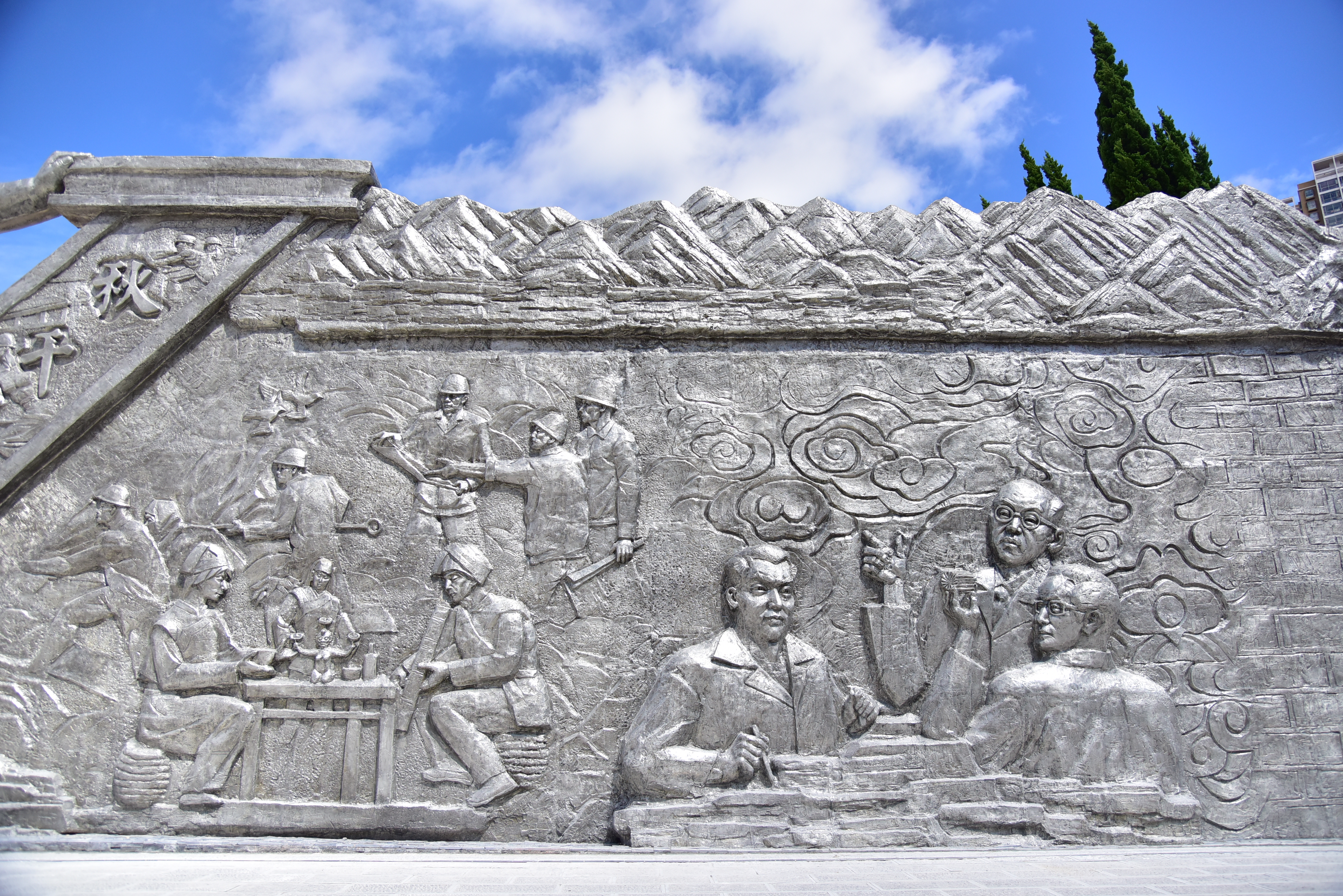錫礦開采歷史的見證者、舊時人背馬馱的運礦方式、不同字體的“錫”字、捧著個舊金湖的雙手、代表哈尼族的吉祥鳥、古老的個舊選廠鐘樓、滇越鐵路、 “云錫三杰”、以熊秉信和丁文江為代表的地質專家,29號小火車、8號礦洞……在以英文字母“Y”為中軸的左側主題浮雕墻上,每一個元素就是一個故事,它們串連在一起仿佛在訴說著“錫映千秋”的歷史輝煌。