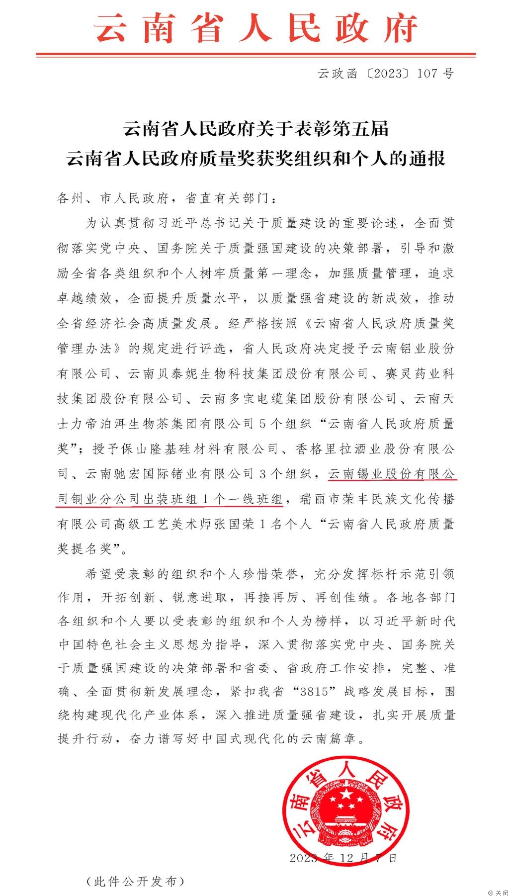 云南省人民政府質量獎是省級最高質量工作榮譽獎,設立的初衷是引導、激勵全省各行各業加強質量管理,追求卓越績效。本屆評選首次加入了一線班組,評選過程嚴格遵循公開、公正、公平的原則,由專家評審委員會進行評審,最終確定獲獎名單。